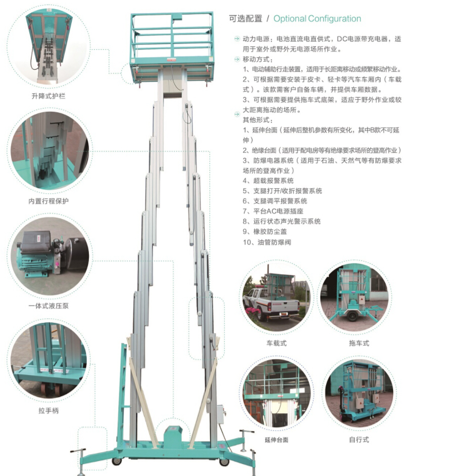 自行式雙桅柱升降平臺(tái):在雙桅柱式升降平臺(tái)上增加一套自行驅(qū)動(dòng)裝置,使得移動(dòng)設(shè)備更加輕松、簡(jiǎn)便。驅(qū)動(dòng)裝置動(dòng)力電源由電瓶供電。